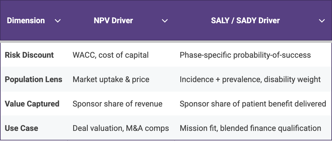 NPV reaches first for finance levers: discount rates, price and market uptake, while the SALY/SADY construct substitutes phase-specific probabilities of success, incidence and disability weights. The side-by-side comparison in Table 1 below makes the contrast explicit and underscores why the two metrics work best together: NPV flags capital efficiency, while SALY/SADY illuminates the magnitude of patient impact.