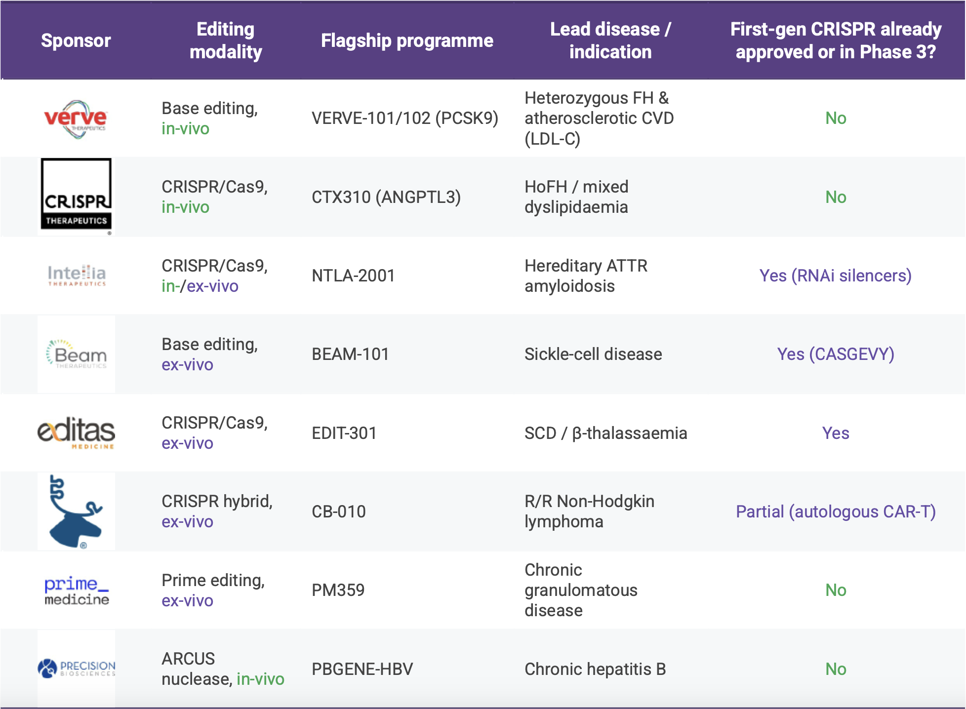 Within that group the spectrum of ambition is striking. Verve, now partnered with Lilly, and CRISPR Therapeutics are pushing into cardiovascular lipid disorders where no first-generation genome editor has yet secured approval, while Intellia is offering a one-and-done alternative to the chronic RNA-interference treatments already in play for ATTR amyloidosis. Intellia also reported fresh NTLA-2002 data yesterday, boosting investor sentiment but not altering its runway guidance. Programmes from Beam, Editas and Caribou focus on haemoglobinopathies or oncology indications that regulators have already seen in an autologous or first-wave CRISPR guise, making differentiation a question of efficiency, safety and patient access. Prime Medicine and Precision BioSciences step into ultra-rare chronic granulomatous disease and chronic hepatitis B respectively, both areas without an existing curative option. We have added Verve/Lilly to the indication table so we can compare how the acquired asset fits alongside the still-independent cohort.