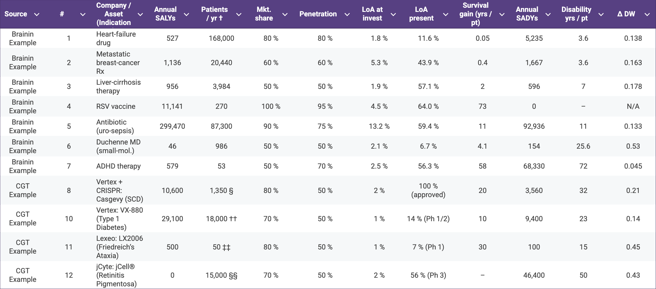 Table 2. Annual Science-Adjusted Life-Years (SALYs) and Science-Adjusted Disability-Years (SADYs) for representative therapeutics spanning Brainin’s original examples and a selection of cell- and gene-therapy (CGT) assets†